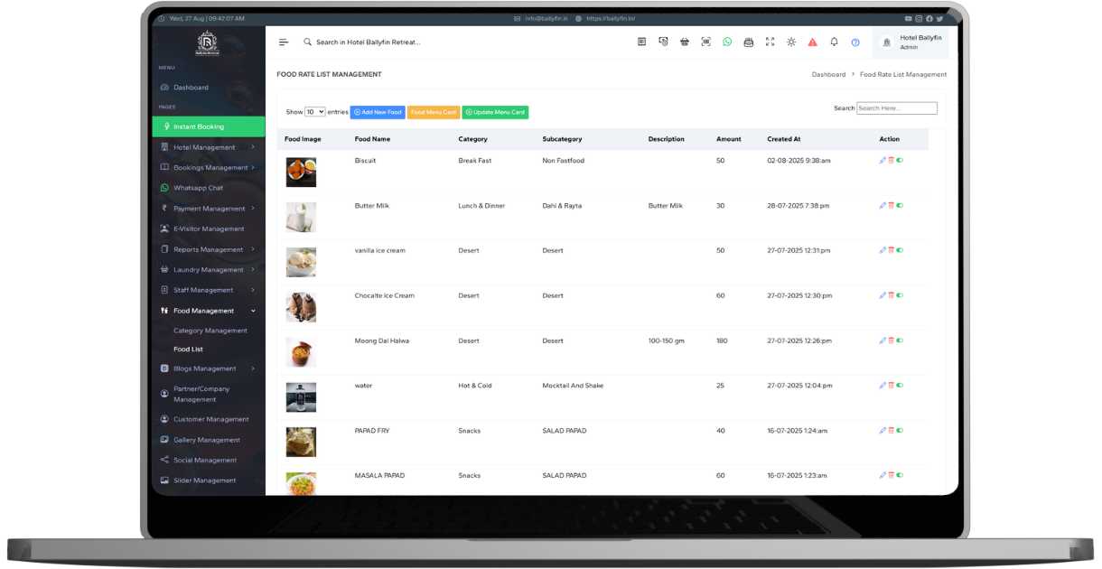 Manage your restaurant operations directly from the hotel management system. Update menus, track item prices, manage food categories, and take guest orders seamlessly. All food-related transactions are linked to the guest’s room billing. This ensures complete control over your food and beverage services and helps you improve guest satisfaction with faster service.