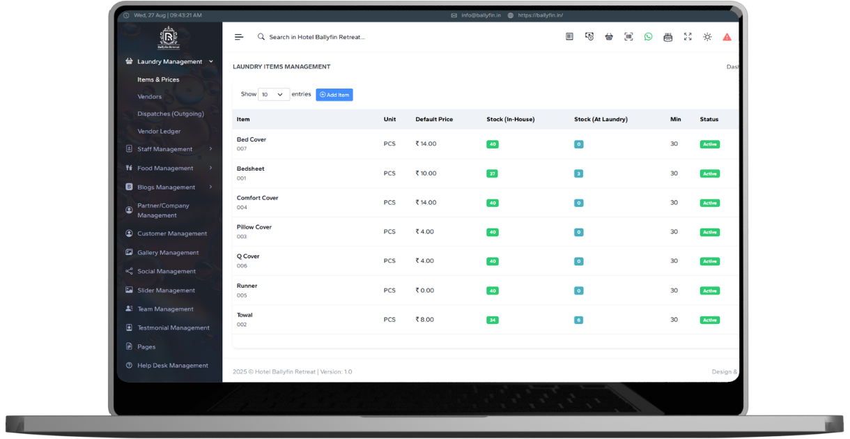 Keep track of all laundry items — from bed sheets to towels — with complete pricing and stock management. Monitor what’s in-house and what’s sent to vendors. This feature ensures timely deliveries, reduces losses, and keeps guests happy with prompt and clean laundry service. A detailed dashboard helps staff manage and coordinate efficiently.